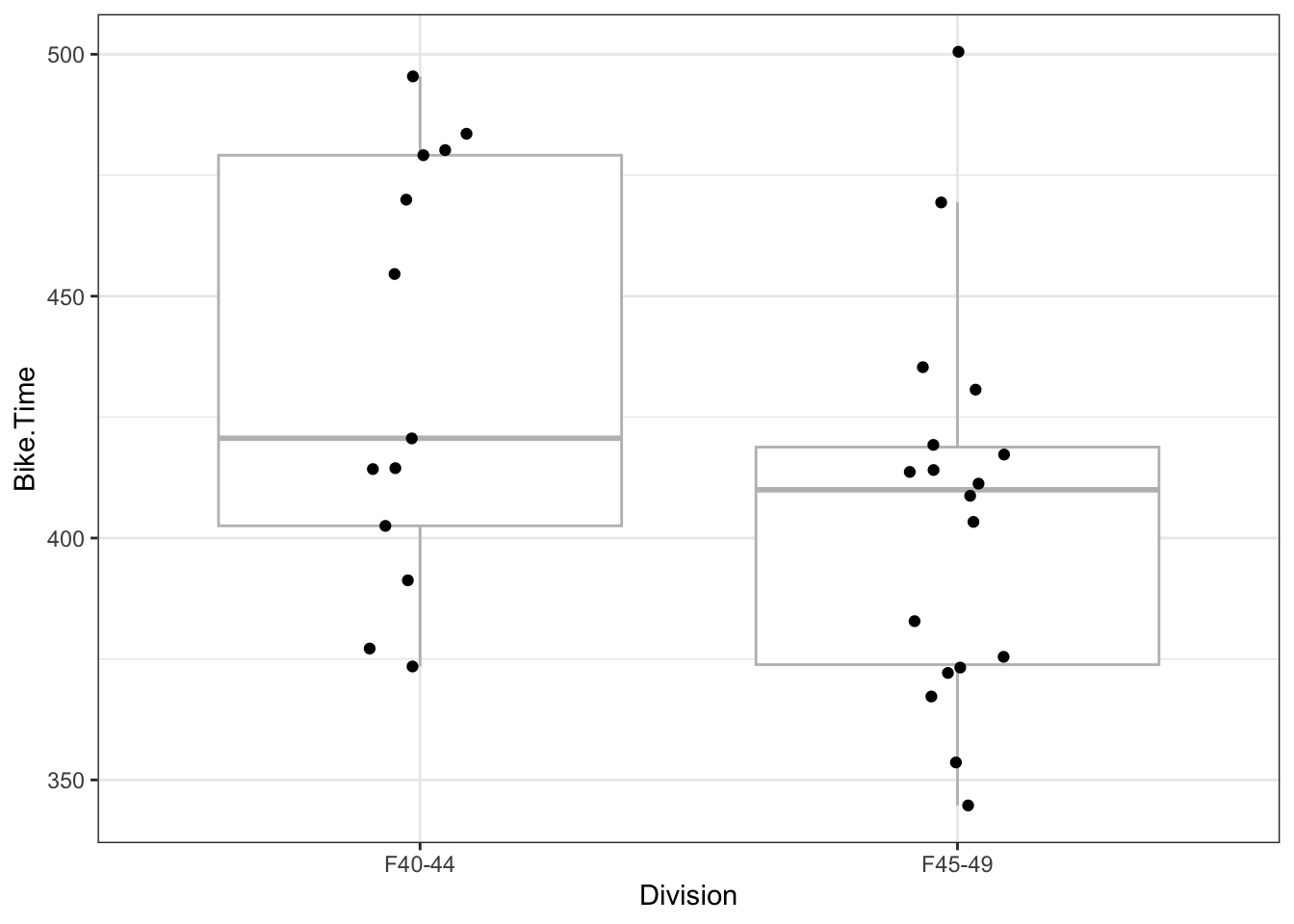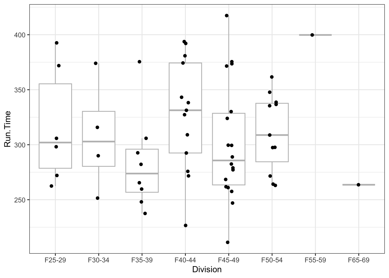 d |>group_by(Division) |>summarize(n =n(),mean =mean(Run.Time),sd =sd(Run.Time) )