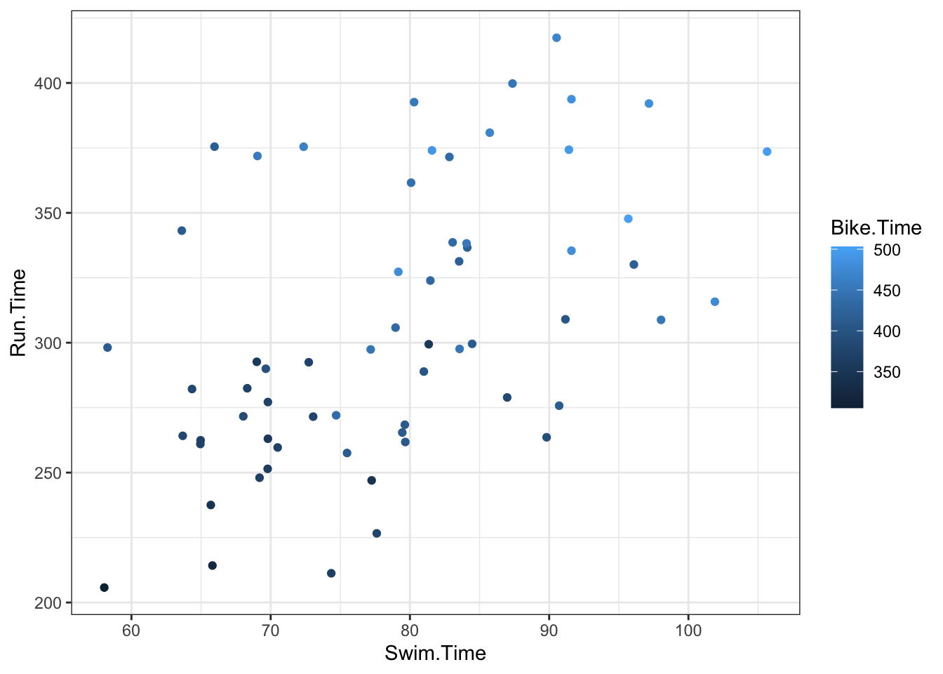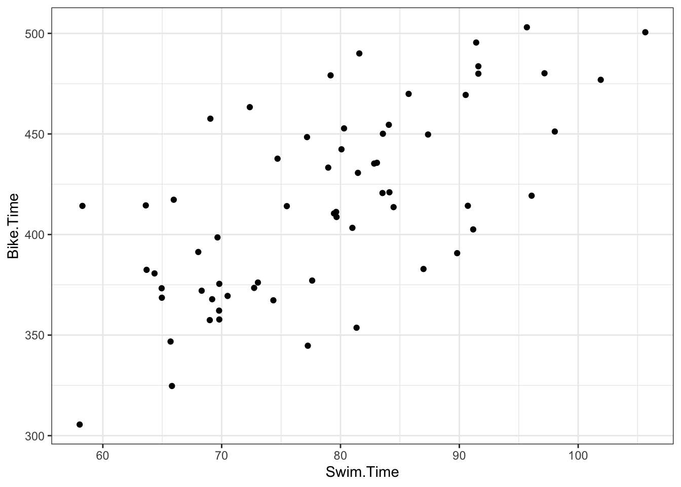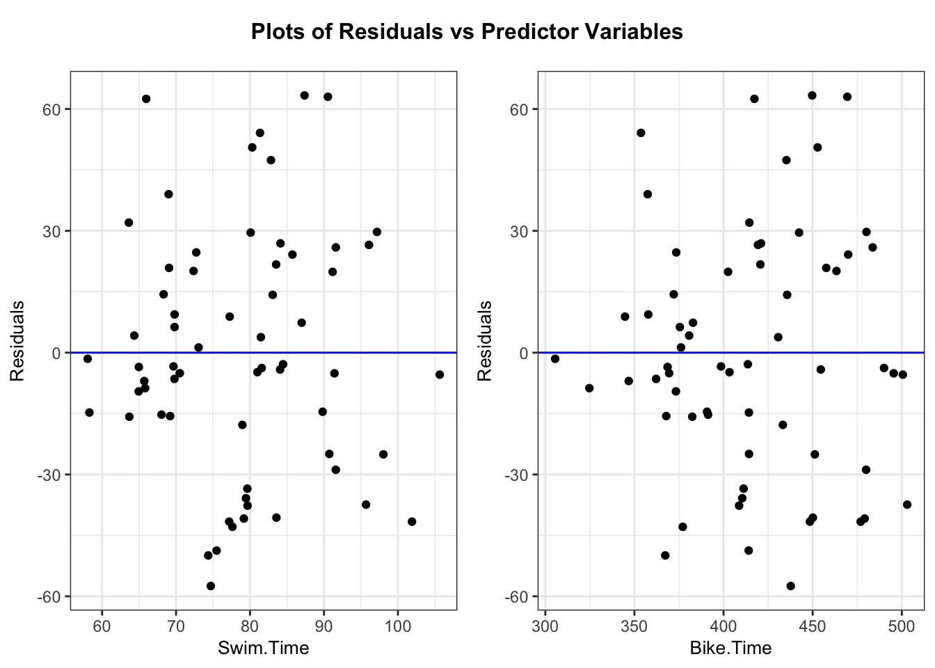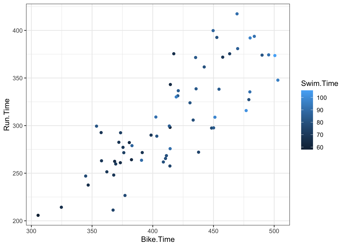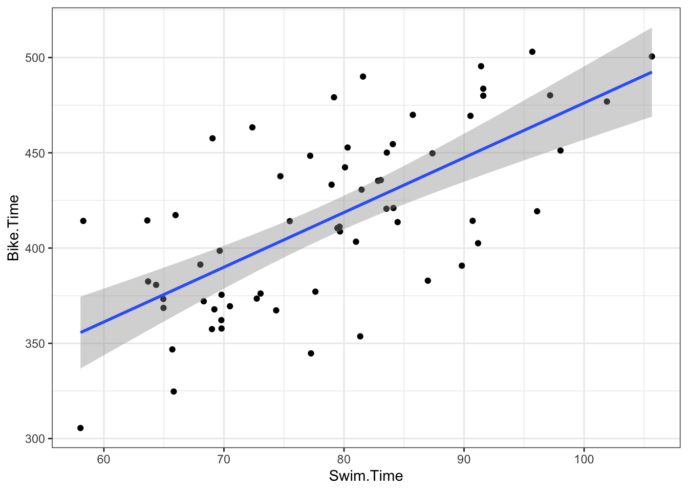 Using the 2022 Women’s Lake Placid Ironman data, we fit a regression model using run time as the response variable and swim and bike times as the explanatory variables. After adjusting for bike time, each minute increase of swim time was associated with a -0.38 minute increase in run time with a 95% interval of (-1.33, 0.58). After adjusting for swim time, each minute increase of bike time was associated with a 0.97 (0.75, 1.2) minute increase in run time. The model with swim and bike time accounted for 67% of the variability in run time.