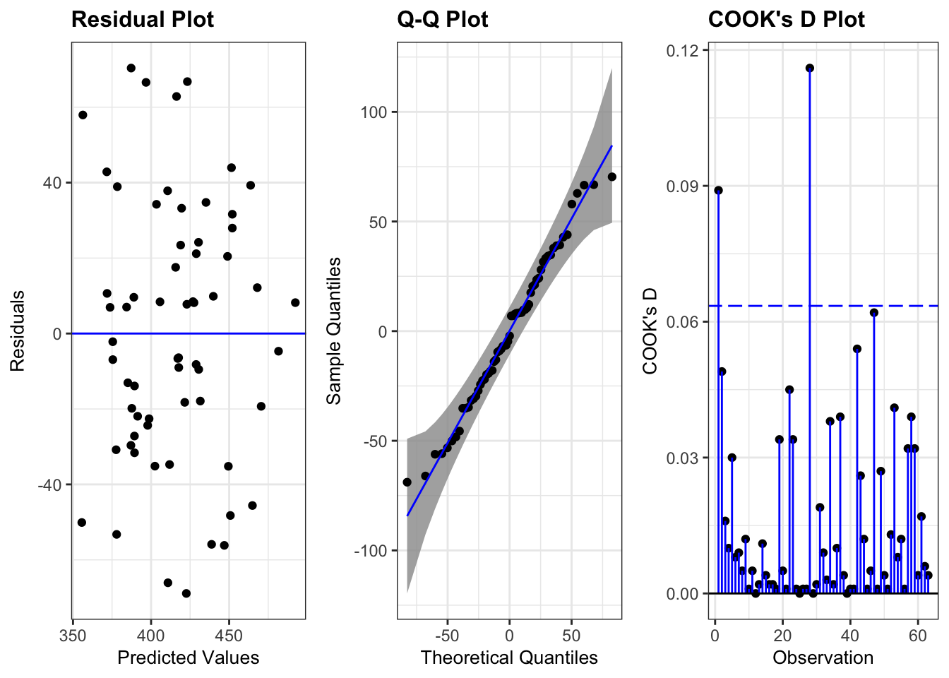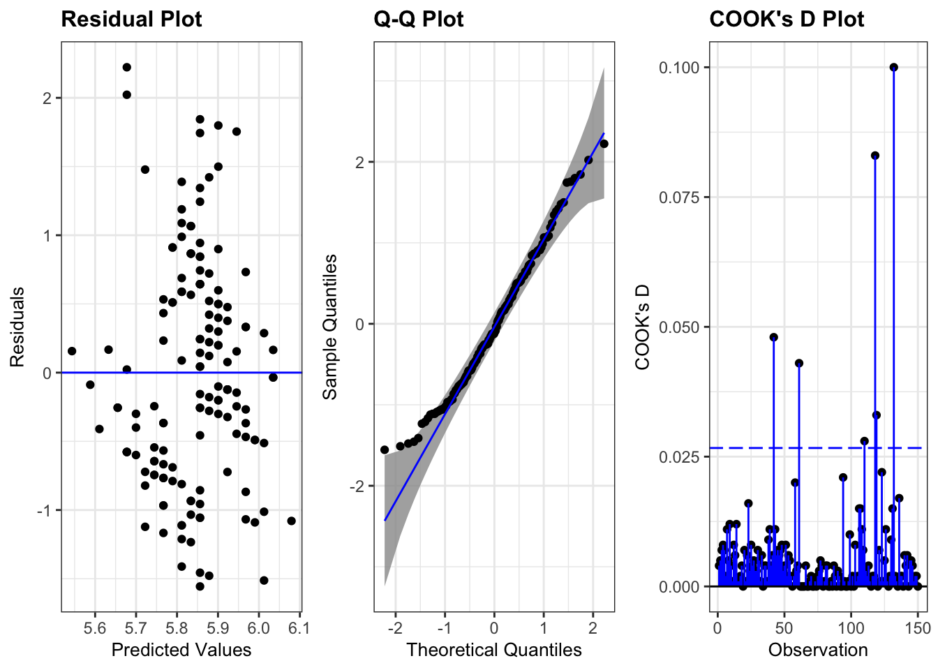 m <-lm(Sepal.Length ~ Sepal.Width, data = iris)ggResidpanel::resid_panel(m, plots =c("resid", "qq", "cookd"), qqbands =TRUE, nrow =1)