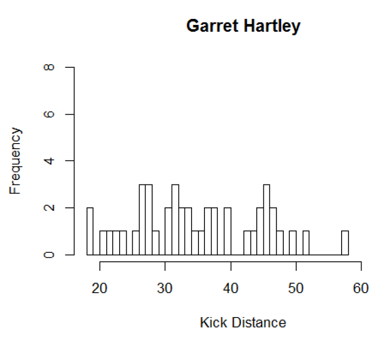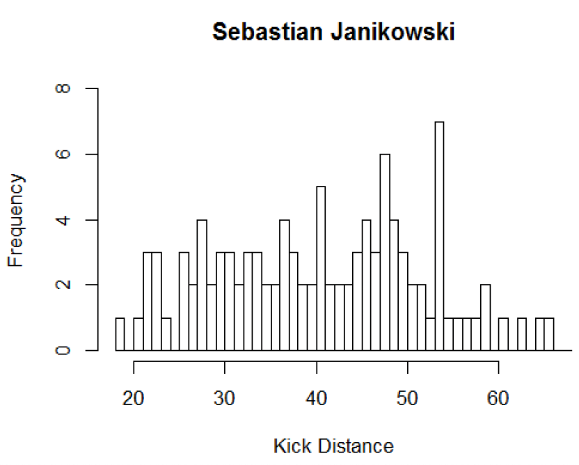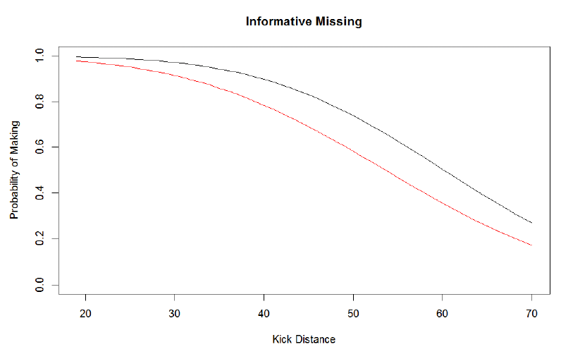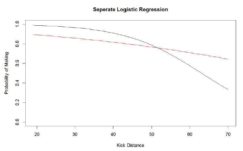 This plot suggests that Janikowski is a better field goal kicker but his probability to make field goals is highly affected by distance while Hartley’s probability is more consistent across the distances. Knowledge of these two kickers will tell you that this is not the case since Janikowski is a renowned long distance kicker.