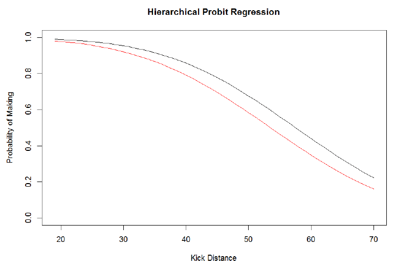 The following is the estimate of Hartley (red) and Janikowski (black) probability of making a kick as a function of distance.